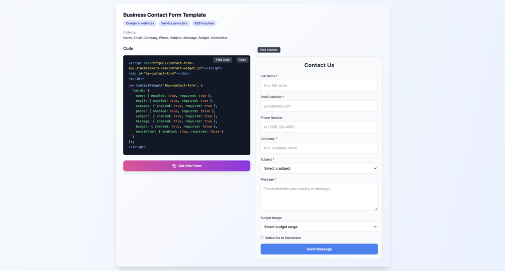 - Collects: Name, Email, Company, Phone, Subject, Message, Budget Range, Newsletter Signup